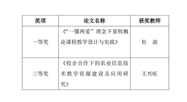 近日,上海市职业教育协会公布了第十八届优秀论文评选结果,评审专家组对全市职业院校和相关职业教育研究单位提交的参评论文进行了评审,共产生一等奖10个、二等奖20个、三等奖30个、提名奖30个。学院斩获两个奖项,分别是杜波老师的《“一懂两爱”理念下畜牧概论课程教学设计与实践》获得一等奖,王兴旺老师的《校企合作下的农业信息技术教学资源建设及应用研究》获得三等奖。