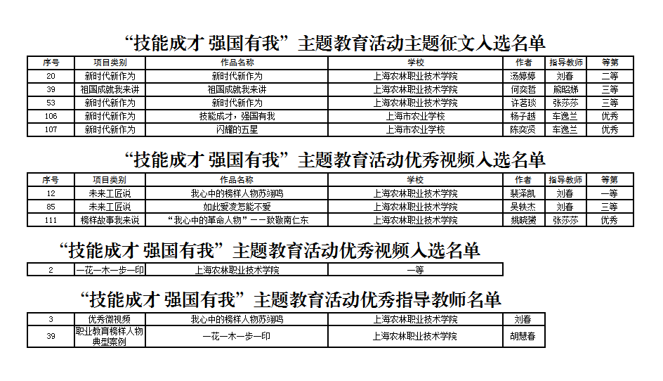 近日,上海市教育卫生工作委员会,上海市教育委员会公布了2022年“技能成才、强国有我”主题教育活动的入选作品名单,学院共获13个奖项,一等奖2个,二等奖2个,三等奖3个,优秀奖3个,2名老师获优秀指导教师,学院获优秀组织奖。