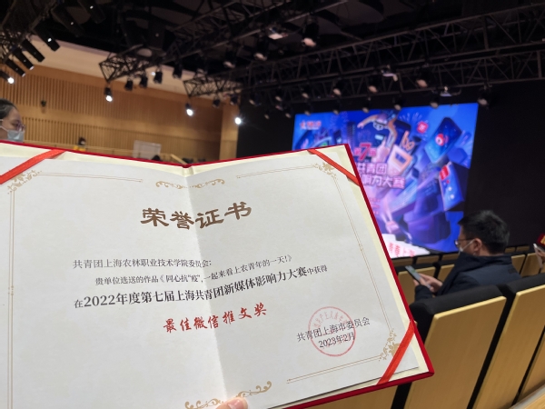 在近日举办的第七届上海共青团新媒体影响力大赛上,团委选送的《同心抗“疫”,一起来看上农青年的一天!》公众号推文,获2022年度第七届上海共青团新媒体影响力大赛“最佳微信推文”奖。