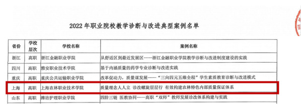 日前,教育部中国教科院职业与继续教育研究所发布“2022年职业院校教学诊断与改进典型案例名单”,学院组织申报的《质量理念人人立 诊改螺旋层层行 有效构建农林特色内部质量保证体系》案例成功入选。