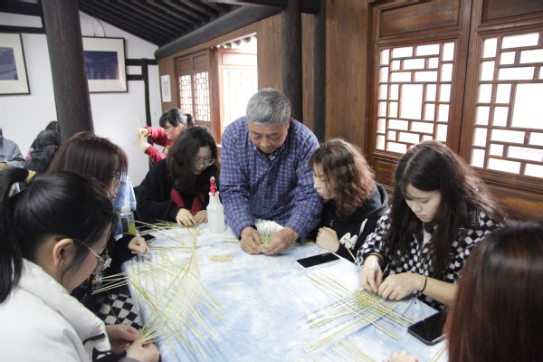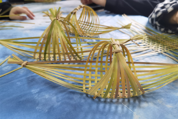 参观结束后,非遗竹编技艺传承人唐正龙老师从采竹、备料、浸泡、染色、编织、锁边六步骤为大家传授竹编知识和技艺,带领师生编织简易竹船。只见唐老师双手一拉、一插、一扎,反复几次,一条栩栩如生的小船就呈现在眼前。唐老师用生动的话语耐心讲解每一个步骤,学生们认真地边看边学边做,一条条小船在他们手中诞生。唐正龙是土生土长的松江人,擅长竹编技艺,被评为松江区级非物质文化遗产传承人,曾荣获2015年上海市民文化节市民手工艺大赛“百名市民手工艺达人”称号、2015年度松江区“百姓明星”家庭手工艺类“百姓明星”称号。