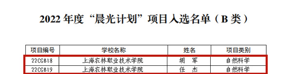 近日,根据《上海市教育委员会上海市教育发展基金会关于公布2022年度“晨光计划”项目入选名单的通知》(沪教委科〔2023〕15号),我院教师胡军申报的《犬源巴氏链球菌关键毒力因子的筛选与鉴定》以及任杰申报的《悬挂式立体栽培模式对草莓生长环境因子的影响研究》课题获得立项。项目研究期限为二年,经费资助为6万元。