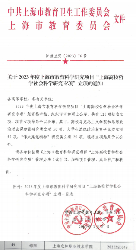 近日,根据中共上海市教育卫生工作委员会、上海市教育委员会《关于2023年度上海市教育科学研究项目“上海高校哲学社会科学研究专项”立项的通知》(沪教卫党委【2023】76号),邵阳主持的“涉农高职院校劳动教育体系构建研究”获得立项。项目研究期限为三年。