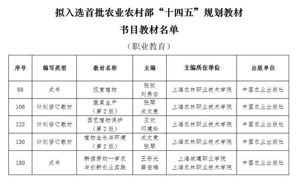近日,农业农村部科技教育司发文公布了《关于拟入选首批农业农村部“十四五”规划教材书目教材名单的公示》,学院教师主编的《观赏植物》《蔬菜生产(第2版)》《园艺植物保护(第2版)》《植物生长与环境(第2版)》《耕读劳动--学农与创新创业实践》共5本教材入选。