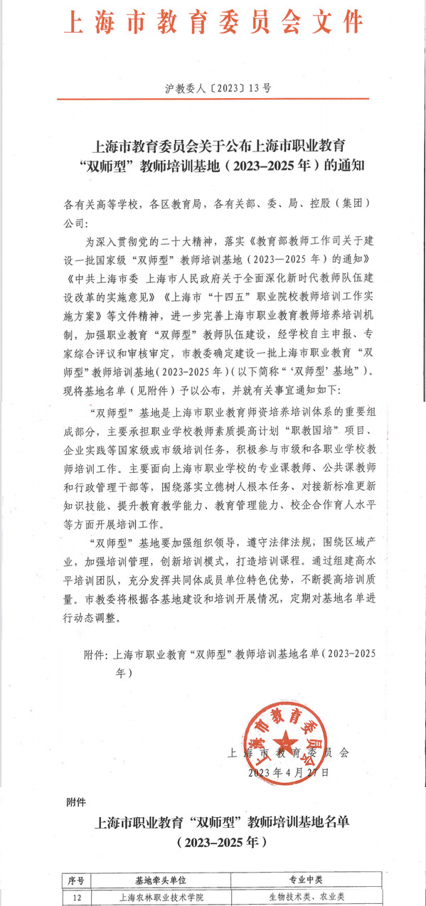 近日,上海市教育委员会发文(沪教委人〔2023〕13号),学院成功获批上海市职业教育“双师型”教师培训基地(2023-2025年)(以下简称“双师型”基地)生物技术类、农业类两个大类教师培训基地。