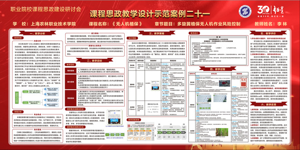 李林老师从教学分析、教学目标、教学策略、教学过程、教学评价以及教学反思六个方面进行课程展示。根据专业教学标准、课程标准、对照1+X植保无人飞机应用职业技能等级标准及无人机植保行业应用岗位要求、学生掌握情况,将多旋翼植保无人机作业风险控制知识内容重新整合教学内容。内容有机融入了无人机植保作业的安全意识、风险评估意识;坚持问题导向,提升认真负责为农服务的职业素养;在植保作业实施中更要坚持创新驱动为导向,利用创新性思维解决实际问题,科学地选择农药配比,制定更加有利于农户节本增效的无人机植保作业方案。真正从“会植保”到“慧植保”,从“新农人”成“兴农人”,成为一名“懂农业、爱农村、爱农民”的无人机植保从业优秀人员。《无人机植保》课程为2022年校级课程思政示范课建设项目,荣获首届上海市课程思政教学设计展示活动职业院校综合专业组一等奖。