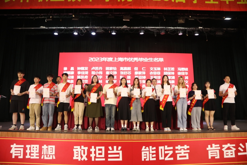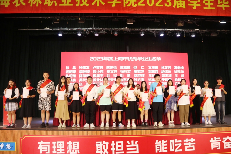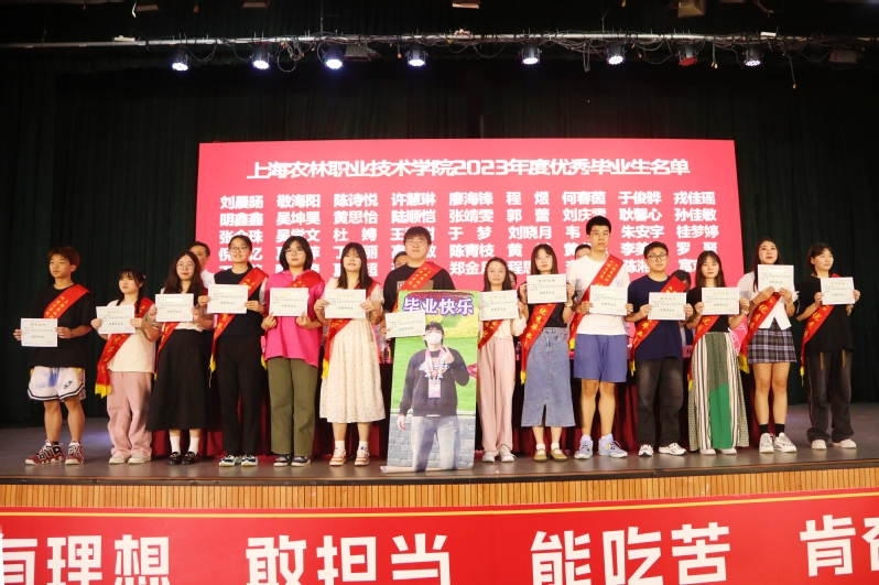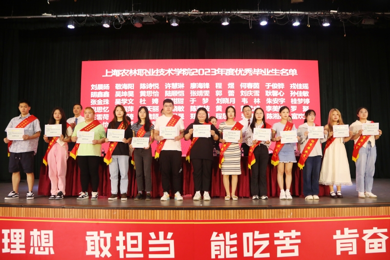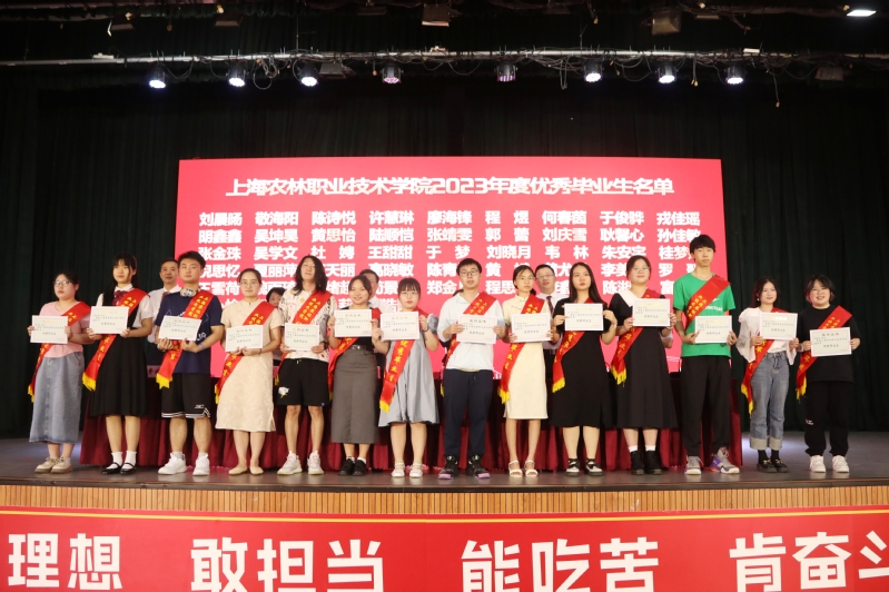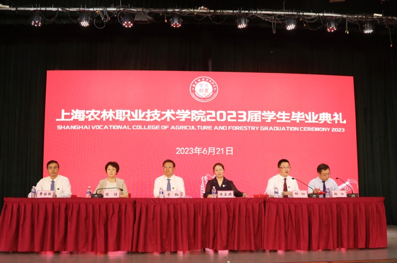 党委副书记、纪委书记陈谊宣读《上海农林职业技术学院2023年度优秀毕业生和2023年度上海市优秀毕业生表彰决定》,副院长张江宣读《上海农林职业技术学院关于准予2023届毕业生毕业的决定》,党政领导现场颁发上海市高校优秀毕业生、学院优秀毕业生和学生毕业证书。