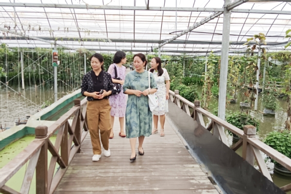 张美琼带领团队参观了农场的日本黄金锦鲤区、“热带雨林”温室、虾蟹稻共作田园、清水草塘风光、泰国皇莲观赏区等区域。参观现场,张美琼对每个区域的功能定位进行了说明,团队就感兴趣的话题进行了交流。