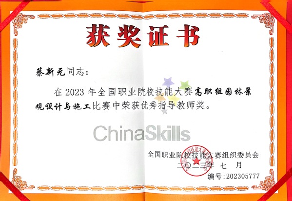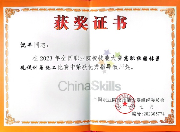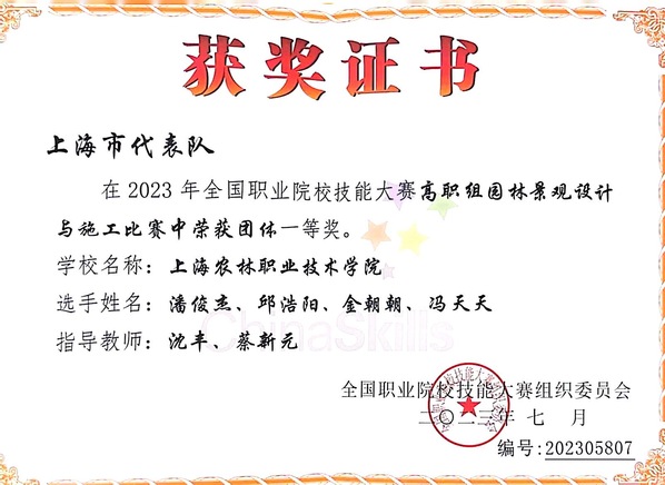 7月23日-26日,2023年全国职业院校技能大赛高职组“园林景观设计与施工”赛项在我院举行,共有来自全国29个省(自治区、直辖市)的55支参赛队伍、220名选手同台竞技。经过激烈角逐,植科系园林(中高贯通)182班潘俊杰、园林(中高贯通)183班邱浩阳、园林(中高贯通)192班金朝朝和园林(中高贯通)181班冯天天四名同学荣获团体一等奖,指导教师沈丰、蔡新元老师荣获优秀指导教师奖。