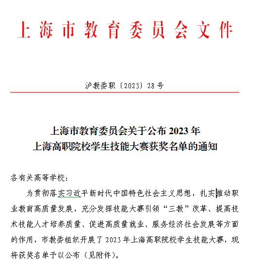 2023 年上海高职院校学生技能大赛由上海市教育委员会职业教育处、上海市教育委员会教育技术装备中心主办,以贯彻落实习近平新时代中国特色社会主义思想,扎实推动职业教育高质量发展为目标,充分发挥技能大赛对职业教育的“树旗、导航、定标、催化”作用,于3-4月份举行比赛,7月份公布比赛结果。