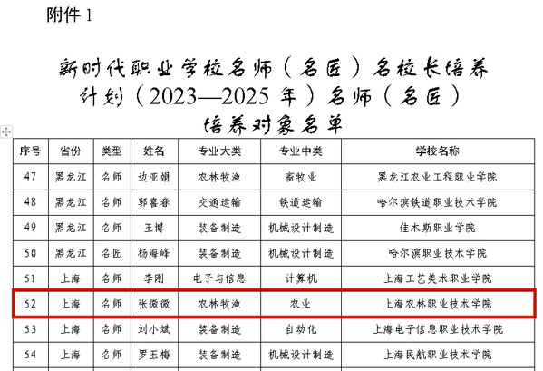 9月27日,教育部办公厅发布了《教育部办公厅关于公布新时代职业学校名师(名匠)名校长培养计划(2023—2025 年)培养对象和培养基地名单的通知》(教师厅函〔2023〕23号),我院教师张微微光荣入选新时代职业学校名师(名匠)培养计划。