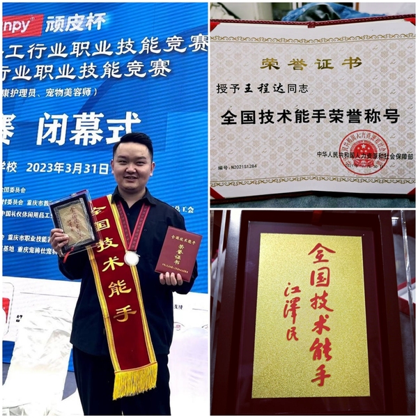 2020年,他参加全国行业职业技能竞赛——全国礼仪休闲行业职业技能竞赛(宠物健康护理员和宠物驯导师)获特等奖。作为宠物行业工作者和优秀毕业生,这项荣誉来之不易。从八月份的预选赛,到总决赛,不仅经过长达4个月的层层选拔,还要与来自全国各地的200多名行业精英同台竞争。赛程中所涉及的宠物护理相关知识,都有赖于王程达在校期间认真的学习、扎实的理论功底、不懈的实操训练,以及工作后大量的实践积累。
