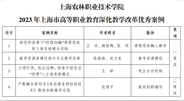 近日,上海市职业教育协会高职高专教学工作专业委员会/上海市高职高专教学研究会公布了2023年上海市高等职业教育深化教学改革优秀案例评选结果,我院送评的4个案例全部获奖,其中一等奖3项,二等奖1项。