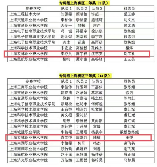 2023年高教社杯全国大学生数学建模竞赛(上海赛区)结果正式揭晓,软件(高本贯通)221班李亦凡、陈宇祥、沈艺雯(教练员刘宝礼)获专科组上海赛区二等奖,软件(高本贯通)211班袁文悦、周嘉邦、陆楠(教练员王悦)获专科组上海赛区三等奖。