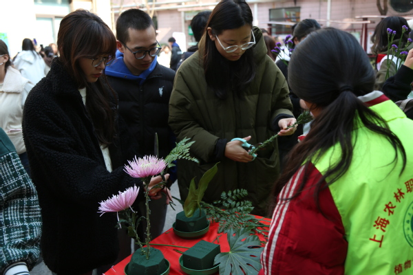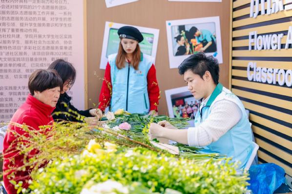当天下午,“云间志愿行 聚力新实践”2023年松江区新时代文明实践志愿服务季开幕式系列活动在松江区新时代文明实践中心举行,同时于泰晤士小镇中心广场开展志愿服务集市,我院艺术插花志愿服务项目到场参与展示服务,与泰晤士小镇的居民们热情互动,以实际行动践行雷锋精神。