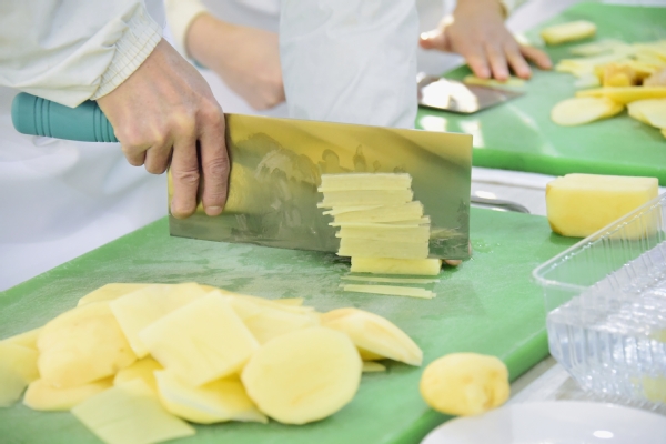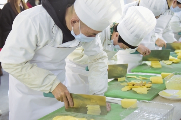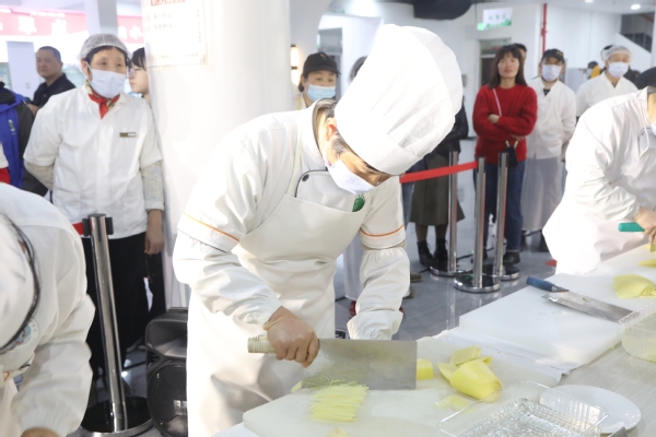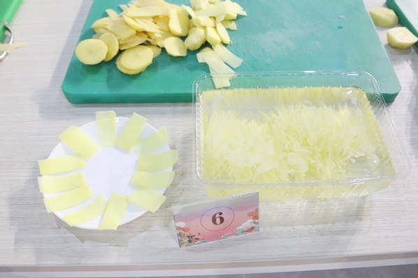 活动正式拉开序幕。首先进行的是刀工技能比赛,共有18名厨工参加,比赛主材是切土豆丝和姜片,选手们需要在规定时间内将2大个完整的土豆和2大块生姜削皮切块,切成70毫米长,0.2毫米细的土豆丝和70毫米长、18毫米宽、0.2毫米厚的姜片。看似简单的刀工比赛,其实是在考验厨工们对刀工手法的运用以及对原材料进行加工处理时,如何正确把握不同形状食材的切配技巧,尽可能将食材全部利用,减少人为损耗。