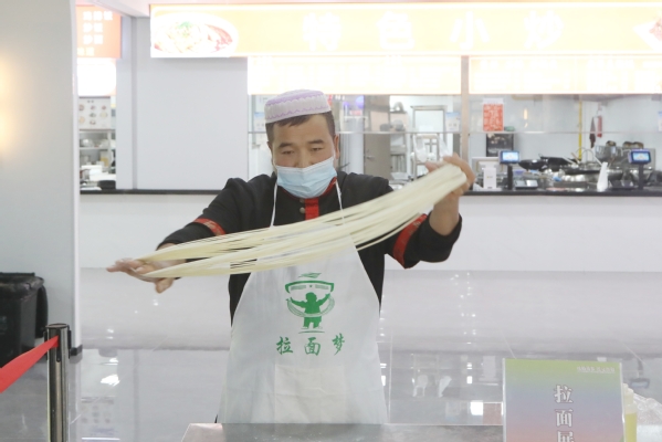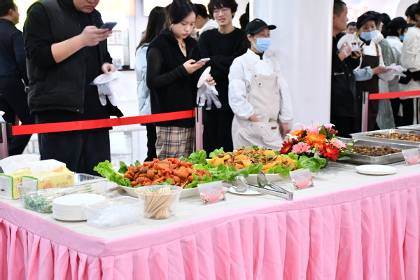 琳琅满目的菜品让师生们目不暇接,纷纷掏出手机拍照留念,菜品香气四溢,引得师生胃口大开,部分师生还亲自上阵动手体验了一把拉面制作和试切土豆丝,让整个活动增添了一份互动和趣味。
