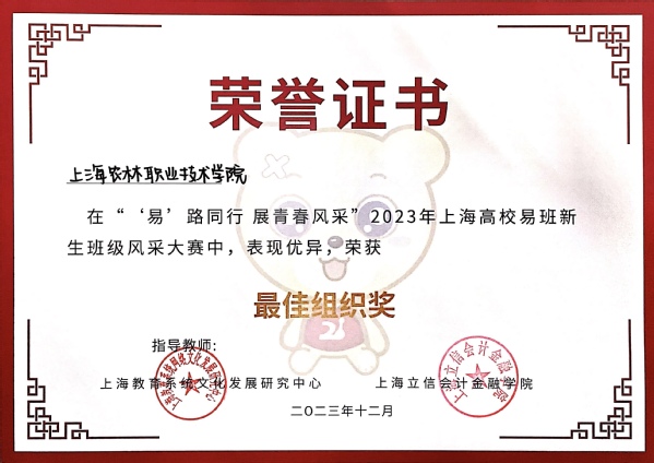 12月10日,由中共上海市教育卫生工作委员会和上海市教育委员会指导,上海市教育系统网络文化发展研究中心、易班网和上海立信会计金融学院主办的“‘易’路同行 展青春风采”2023年上海高校易班新生风采大赛总决赛在上海立信会计金融学院举行。学院荣获“最佳组织”奖。