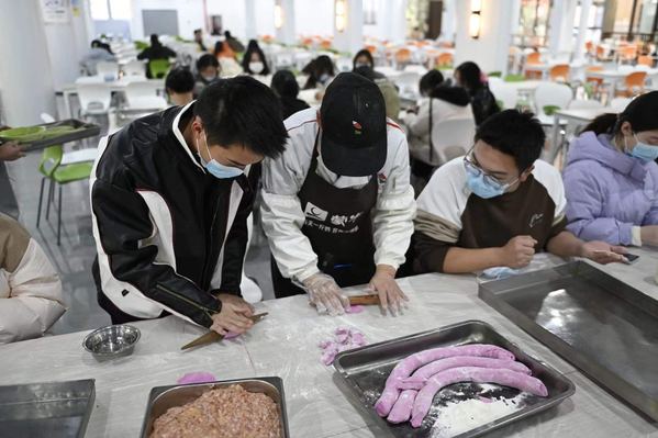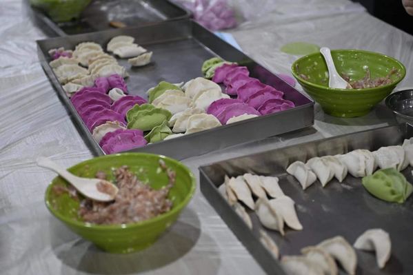 活动现场,学院精心准备了白菜猪肉馅、玉米猪肉馅、韭菜鸡蛋馅等口味的馅料,以及由菠菜汁、火龙果汁和成的彩色面团,师生们一起包饺子,感受传统节日的魅力。“擀面皮要边缘薄、中间厚,一手拿擀面杖、一手转面皮”“将肉馅放在饺子皮中间,可以在饺子皮边缘沾一些清水,再将饺子皮对折,像这样弄出褶皱。”食堂师傅把切好的馅料与饺子皮放在桌前,从调味开始,一一教学,大家互相帮助,热心地分享包饺子的技术和经验、包饺子的方法和馅料的搭配。