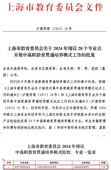 近日,上海市教育委员会公布了《关于2024年增设20个专业点开展中高职教育贯通培养模式工作的批复》(沪教委职〔2023〕56号),学院与上海食品科技学校联合申报的生物产品检验检疫专业获批中高职教育贯通培养模式专业。