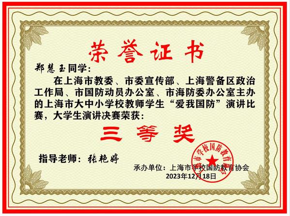 2023年,学院斩获上海市学校国防教育多项活动奖项:上海市大中小学校教师师生“爱我国防”演讲比赛三等奖;上海市高新军事课教学展示,2023年彩弹射击对抗赛优秀组织奖;“上海市高校国防教育实践展示战术实战交流赛”团体三等奖。