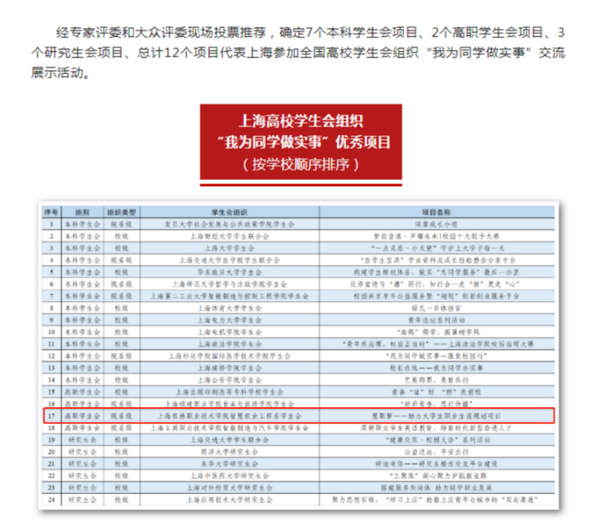 2023年12月10日,上海市高校学生会组织“我为同学做实事”交流展示活动在华东师范大学举行,以“学思想·做实事·树新风”为主题,前期遴选产生的24个优秀项目进行现场路演。现场,智工系系学生会负责人陈家瑶结合实际工作经验以TED演讲的形式进行展示,突出项目旨在为不同年级学生的职业生涯规划目标设立出谋划策,充分展现了智工系学生会全心全意服务同学的青春风采。经专家评委和大众评委现场投票推荐,确定7个本科学生会项目、2个高职学生会项目、3个研究生会项目、总计12个项目代表上海参加全国高校学生会组织“我为同学做实事”交流展示活动,智工系作为全市2个高职学生会项目之一获推全国交流展示。