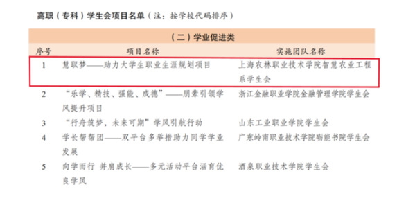 近期,由共青团中央指导、全国学联主办、贵州省学联承办的全国高校学生会组织“我为同学做实事”项目交流展示活动入选名单公布,经学校自荐、省级推报、全国遴选,共产生高职(专科)学生会项目56个,智慧农业工程系学生会“慧职梦-助力大学生职业生涯规划”项目成功入选全国高校学生会组织“我为同学做实事”项目交流展示活动,学院作为全国“学业促进类”5所入选的高职(专科)之一。