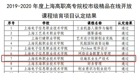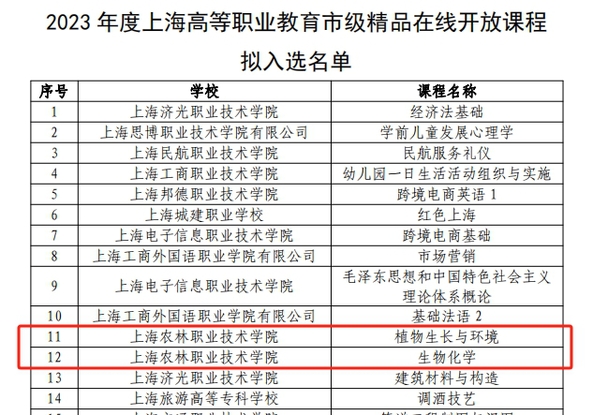 日前,从《关于2023年度上海高等职业教育市级精品在线开放课程拟入选名单和2019-2020年度上海高职高专院校市级精品在线开放课程培育项目认定结果的公示》中获悉,《植物生长与环境》《生物化学》2门课程获批2023年度上海高等职业教育市级精品在线开放课程立项,《设施农业生产技术》课程通过了2019-2020年度上海高职高专院校市级精品在线开放课程培育项目认定。此次通过遴选的市级精品在线开放课程将在上海职业教育智慧教育平台上发布。目前,学院建有国家级(在线)精品课程3项,国家级精品资源共享课1项,市级精品(在线开放)课程29项,校级精品在线开放课程40项。