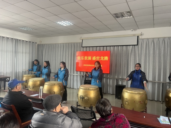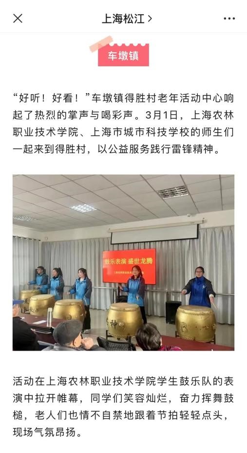 阳春三月,草长莺飞,花红柳绿,东风纸鸢。德胜村一年一度的“弘扬雷锋精神,关爱高龄老人”主题节日也在此时到来。借此时机,基础部《公共艺术》课教师组织学生们走出校园,将课程所学转化为社会公益服务,为得胜村的老人们带去了一支新年贺曲——农乐作品《盛世龙腾》。演出获得“上海松江”公众号报道,引起了一定的社会关注与反响。