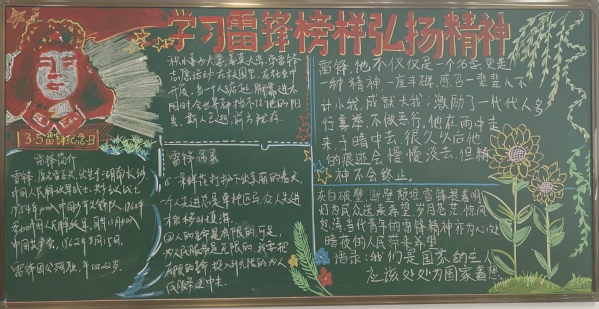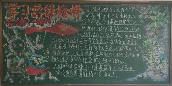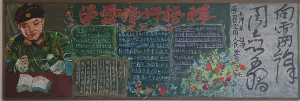为弘扬雷锋精神,彰显时代担当,践行文明校园创建活动,进一步加强学生的思想道德建设,展现师生良好的精神风貌。组织开展了“学习雷锋榜样,弘扬榜样力量”黑板报风采展示活动。在班主任的指导下,各班紧扣主题,认真选材,精心制作,通过寻找“雷锋身影”,讲述“雷锋故事”等,践行雷锋精神。