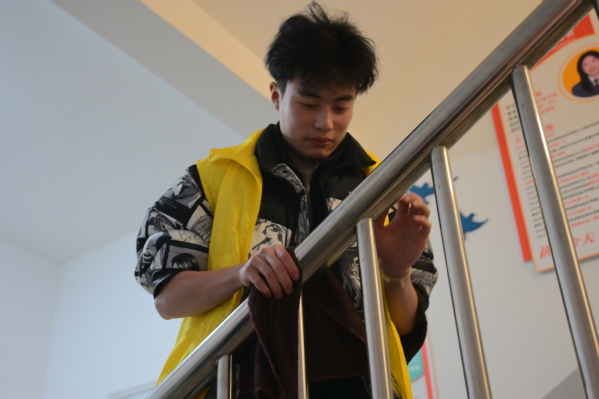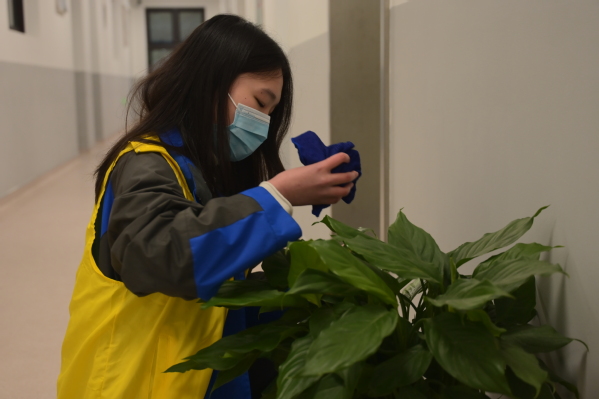 3月5日,30多名学生志愿者来到第二教学楼,分小组加入到“净化学习环境”大扫除行动,同学们干劲十足,分工明确,各司其职,有学生擦拭各个楼层休闲区的桌子、楼梯扶手,有学生整理图书角、茶水间、储物间;还有学生为绿植浇水、擦灰。