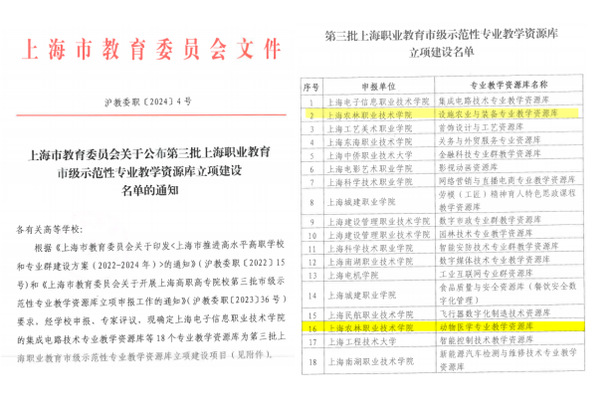 近日,根据《上海市教育委员会关于公布第三批上海职业教育市级示范性专业教学资源库立项建设名单的通知》(沪教委职〔2024〕4号)获悉,我院设施农业与装备、动物医学专业教学资源库被确定为第三批上海职业教育市级示范性专业教学资源库建设项目。