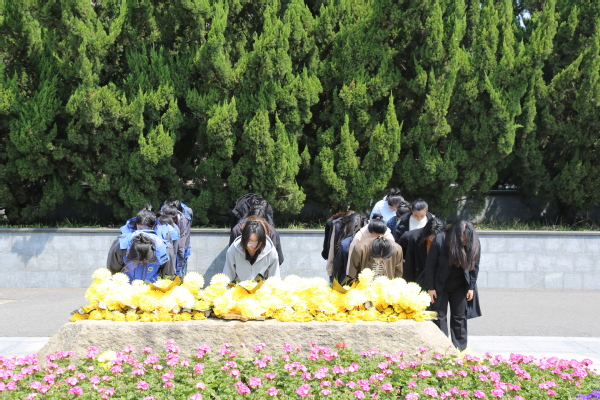 进入松江烈士陵园,师生们站在高大雄伟的纪念碑前,大家怀着无限敬意向革命先辈鞠躬并敬献花圈,深切缅怀革命先烈。随后,师生一行来到烈士碑林前瞻仰,向革命烈士三鞠躬,致英烈以无限追思和崇高敬意。