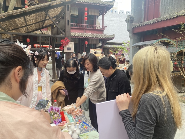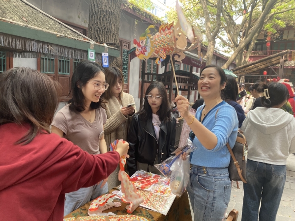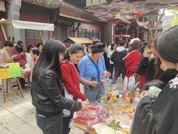 活动现场,创意系师生为“百花节”设置了精彩的非遗和文创类项目。文创、旅管2个专业,文旅活动策划、文创产品设计、文案写作、新媒体营销实务等7门课程,8个班级270余位学生为叶榭村民呈现了一场优秀传统文化盛宴。葫芦、稻米文化、荷花漆扇、破晓龙狮等非遗把游客带入另一个非遗空间。投壶、蹴鞠、射箭、猜灯谜等传统游戏,吸引游客踊跃参与,人气爆棚。文创青年学生着古装铠甲组成禁军,维持秩序,展示表演并着古装接待摆摊展示文创小作品,同时为游客准备了古装体验、歌曲联动和文艺表演等节目。