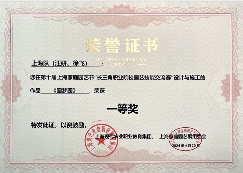 4月18日-20日,由上海市绿化委员会、上海现代农业职教集团主办,上海市花卉产业体系、上海上房园艺有限公司联合承办的 “长三角职业院校园艺技能交流赛”在上房园艺・梦花源落下帷幕,我院园林专业师生的参赛作品《圆梦园》荣获大赛一等奖。