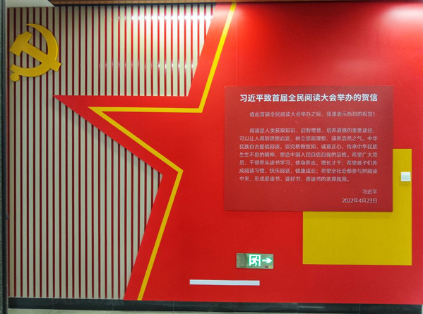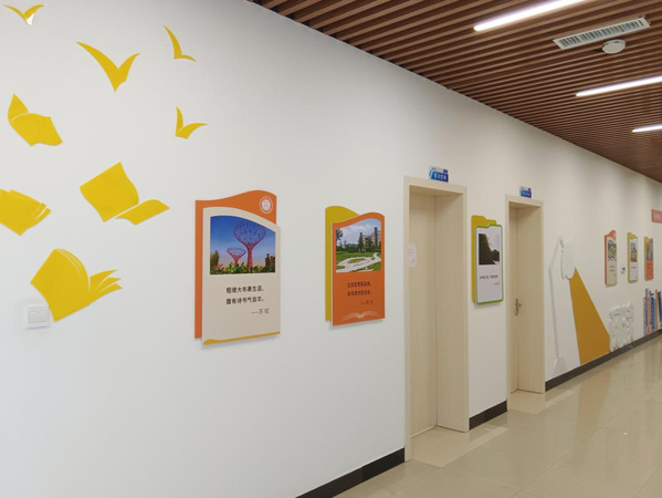 走出借还室,与朗读亭相对而立的是一面贺信墙,习近平总书记致首届全民阅读大会举办的贺信全文登载:阅读是人类获取知识、启智增慧、培养道德的重要途径,可以让人得到思想启发,树立崇高理想,涵养浩然之气。中华民族自古提倡阅读,讲究格物致知、诚意正心,传承中华民族生生不息的精神,塑造中国人民自信自强的品格。希望广大党员、干部带头读书学习,修身养志,增长才干;希望孩子们养成阅读习惯,快乐阅读,健康成长;希望全社会都参与到阅读中来,形成爱读书、读好书、善读书的浓厚氛围。