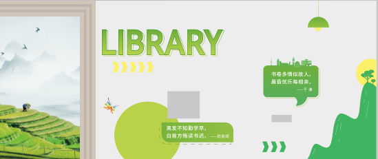 沿着长廊往电梯方向行进,会看到左手边是蓝白色系的名人名言立柱,研讨室内装帧着有梯田高山松树的绿白系画面,再结合颜真卿“黑发不知勤学早,白首方悔读书迟”和于谦“书卷多情似故人,晨昏忧乐每相亲”的名言,同学们一定愿意走进研讨室,对画而坐或发呆冥想或伏案而书,给自己一个独自思考的领域。