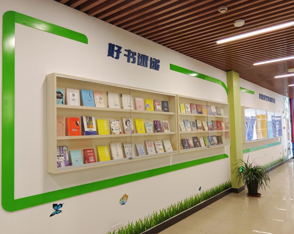 往右看,对面墙上镶嵌着一长排书架,周边环绕着草地、兰花、蝴蝶、绿竹,这是好书速递墙。阅读是智慧的源泉。书架上摆放着图书馆为建设学院2024年“书香班级”精选推荐的好书,涉及心理学类、哲学类、人物传记类、纪实文学类、家书类、二十四节气类、影视文学类和哲思、心理、时间、运动类及治愈类书籍共9类120本。师生走过看到想翻阅的图书,可以自行打开玻璃移门进行翻阅后放回原处,若想借阅可以走进借还室在自助借换机上办理借阅手续借走图书。
