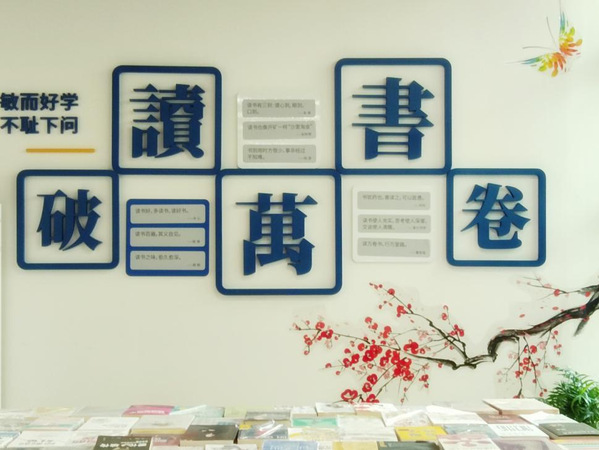 转过名人名言立柱,就到了24小时开放空间,朝北坐到通过预约系统预约好的座位上,抬头看,经过艺术设计的“读书破万卷”五个大字映入眼帘,左上角是“敏而好学 不耻下问”,右下角伸出梅花枝干,上面盛开着朵朵梅花,蝴蝶在蹁跹起舞。你若盛开,蝴蝶自来。用心的同学走近细看,会发现五个艺术字之间还写着古今中外名人的名言,是什么呢?这需要同学们来发现和品味。