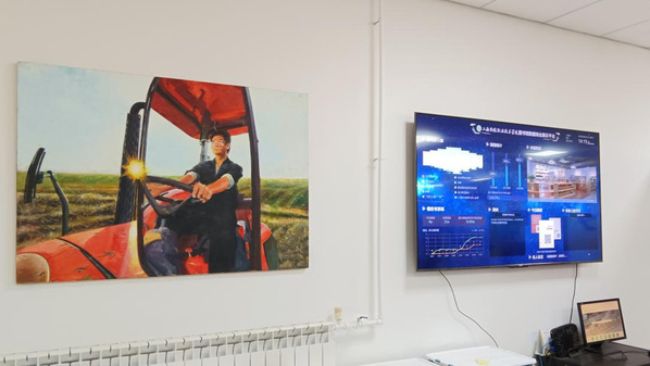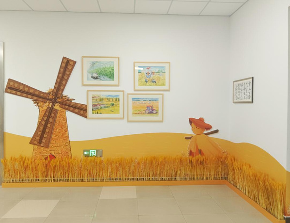 转过贺信墙,来到校史馆后门出口处,就看到戴着草帽的稻草人站在金灿灿的田野上,向远处的风车张望,不禁联想到唐吉诃德大战风车的场景。墙上四幅画作展现了当今农业农村农民的风采及现代农业技术发挥作用的场景。这是校史馆在未来展望区域大型油画场景的延展,是人们对美好生活的向往,是上农师生走在为农服务大道上的美好愿景。
