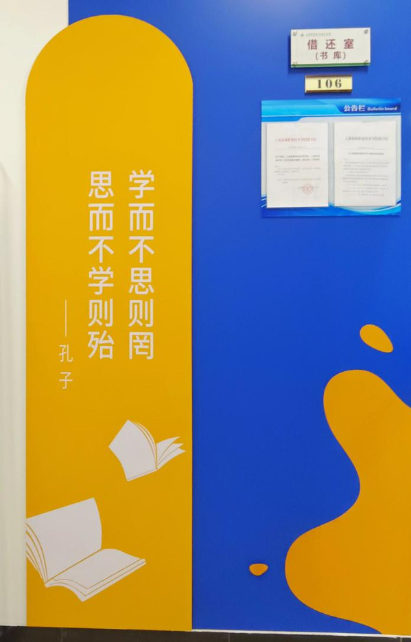 坐久了,想到借还室去看看书,中国历史上第一位真正的老师孔子的名言“学而不思则罔,思而不学则殆”静静地伫立着,不禁让人整理衣冠、调整心情走进借还室,进门就看到一幅“笑盈盈的男生驾驶着收割机”的油画迎候师生到来,还有数据综合展示平台,实时更新显示借阅排行榜、到馆统计、借还书统计、今日推荐、历史上的今天等信息。为了方便师生浏览,在进门右手边的墙上大屏滚动播放推荐的好书介绍,还有一台直立的电子书阅读机可以供师生浏览翻阅。