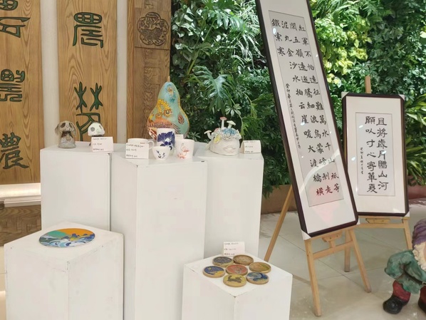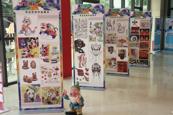 展览分为绘影书义、产教融合、文创赋能、乡村振兴4个板块。“绘影书义”展示学生绘画和书法作品,表达了学生对艺术的热爱和追求;“产教融合”展示了与企业合作的文创成果和数字经济与创意系在产教融合方面的探索;“文创赋能”展现了学生在传统文化与现代设计结合创新,为传统文化的传承与创新带来新活力;“乡村振兴”板块聚焦美丽乡村建设,以专业设计图稿为“笔” 绘就乡村振兴美丽画卷。