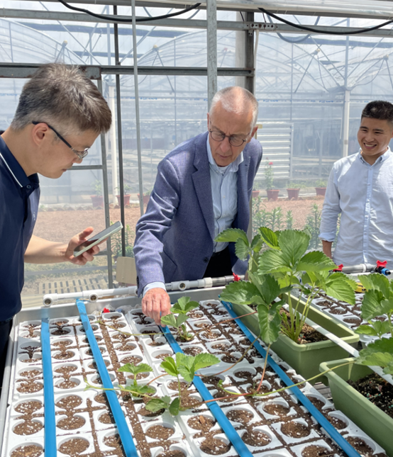 在草莓苗三级繁育扩繁温室,成文竞介绍了植科系近年来利用组培技术繁育草莓脱毒苗的成果,草莓项目负责教师刘林介绍了草莓苗压条繁殖的技术要点及挑战,Jasper教授就草莓苗灌溉技术与师生进行交流。
