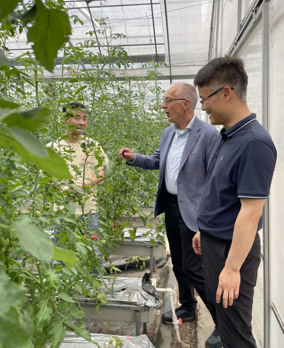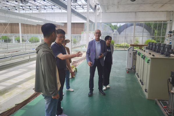 在杨平老师的带领下,大家一同来到半封闭植物工厂和番茄生产温室,Jasper教授肯定了我院在设施智慧园艺上的建设成果,并营养液循环灌溉技术及番茄栽培技术进行交流。