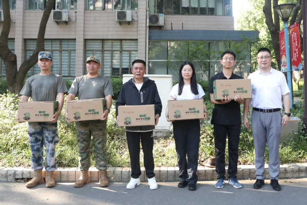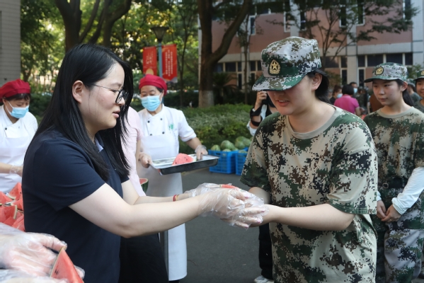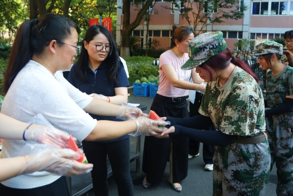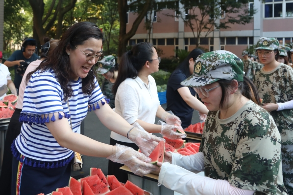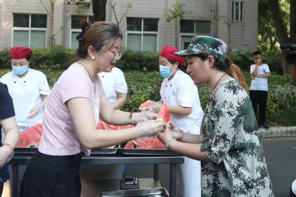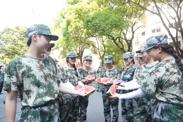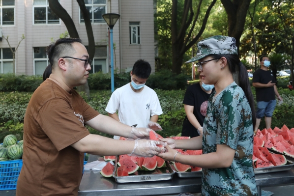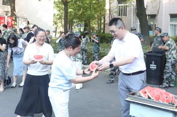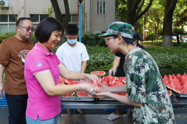 慰问团为全体参训学生发放了清凉解暑的西瓜等慰问品,叮嘱大家军训期间注意饮食,及时补充水分,并为同学们加油鼓劲,以更加饱满的热情投入到接下来的训练中,圆满完成军训任务。