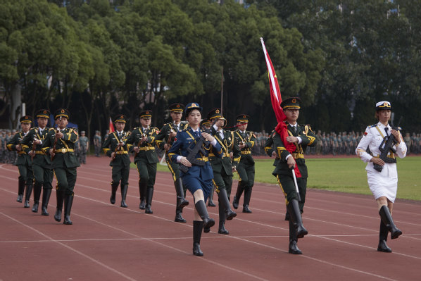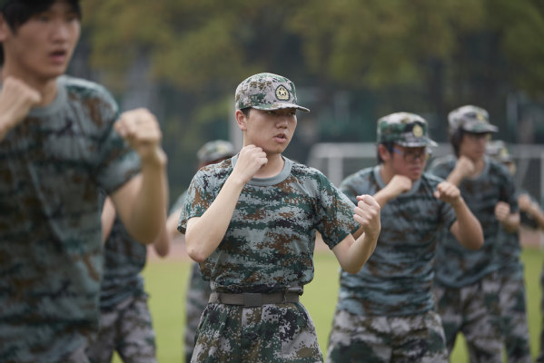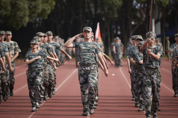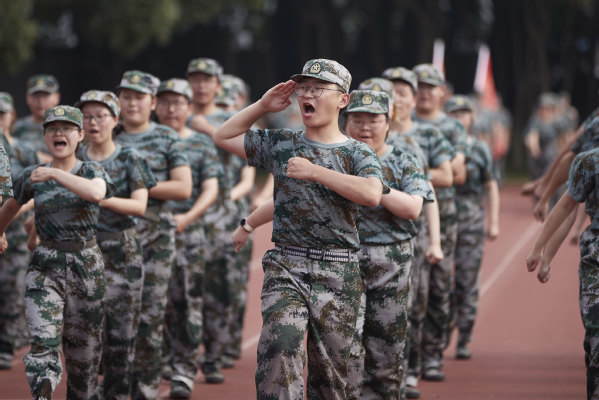 军训总教官报告集合完毕,陈立婧宣布仪式开始。嘹亮的口号声响彻整个校园,在总教官的陪同下,各连队接受检阅,同学们士气高昂、整齐划一,充分展现出上农学子风采。