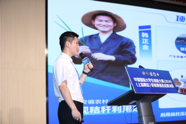 马建超、赵猛为决赛评委颁发聘书。同济大学创新创业学院副院长殷俊峰、学院植物科学技术系园艺221班韩正金分别代表全体评委和参赛选手进行宣誓。