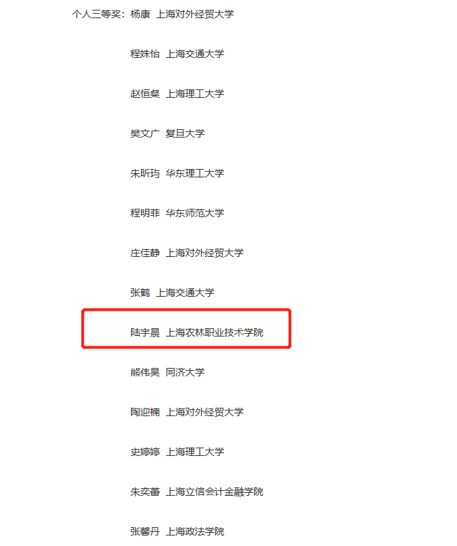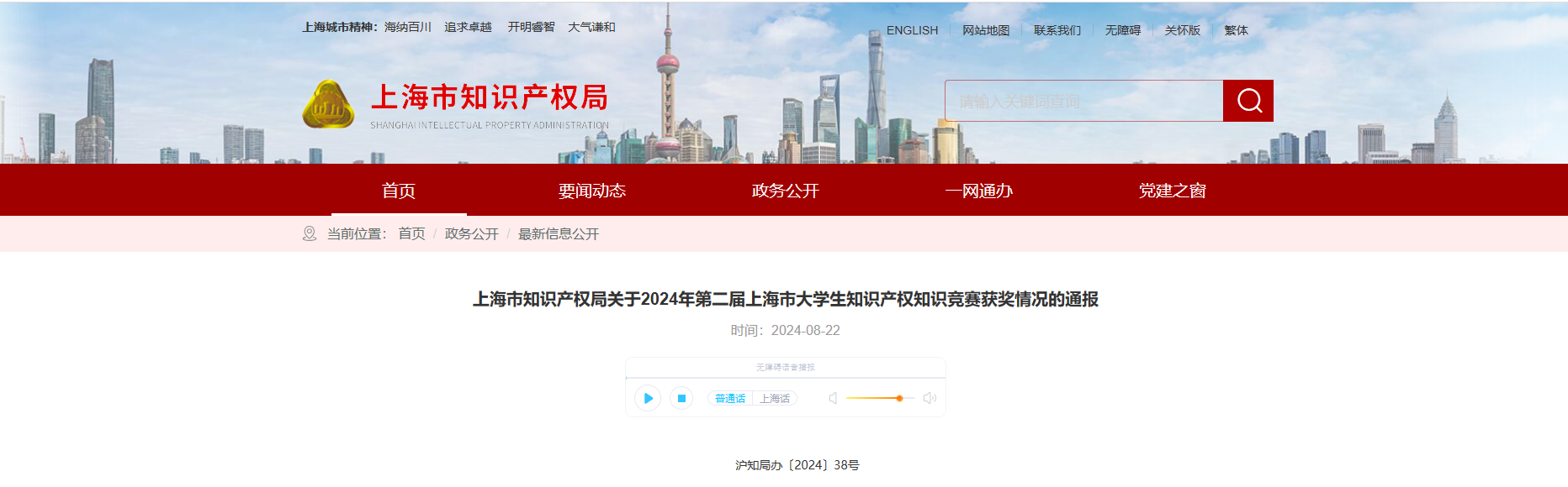 近日,2024年第二届上海市大学生知识产权知识竞赛圆满举办。本次竞赛由上海市知识产权局主办,上海对外经贸大学承办,以“知识产权基础知识与实践应用”为主题,共16支高校代表队参加比赛。我院生物医药健康系陆宇晨和植物科学技术系唐栗岑同学分别获得个人三等奖与个人鼓励奖,周燕华老师荣获优秀指导教师奖。