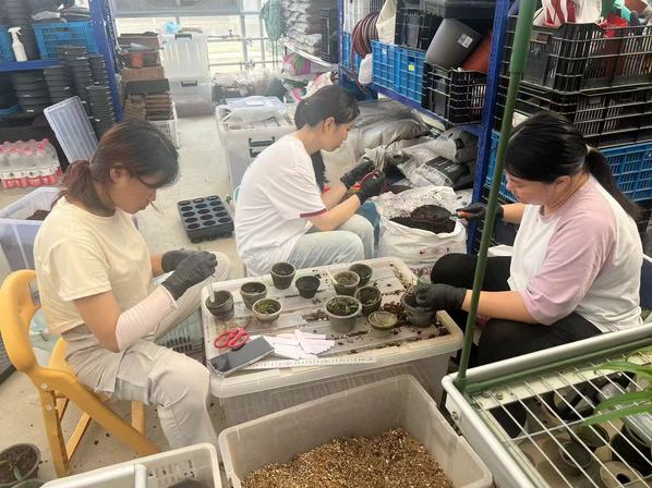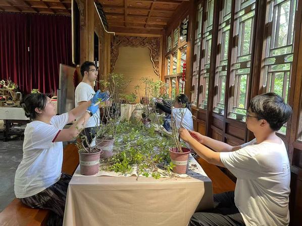 上海植物园“盆景兰花班”成立于2024年6月,共有11名学生组成,来自植物科学技术系园林技术、园艺技术、花卉生产与花艺、园林工程技术等专业。今年7月至今,园方结合学生志趣和岗位需求,将学生分为三组,分别在上海植物园盆景园、兰室、温室实习。