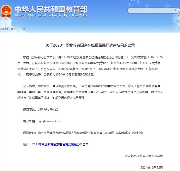 图1 教育部办公厅关于公布2023年职业教育国家在线精品课程遴选结果的公示